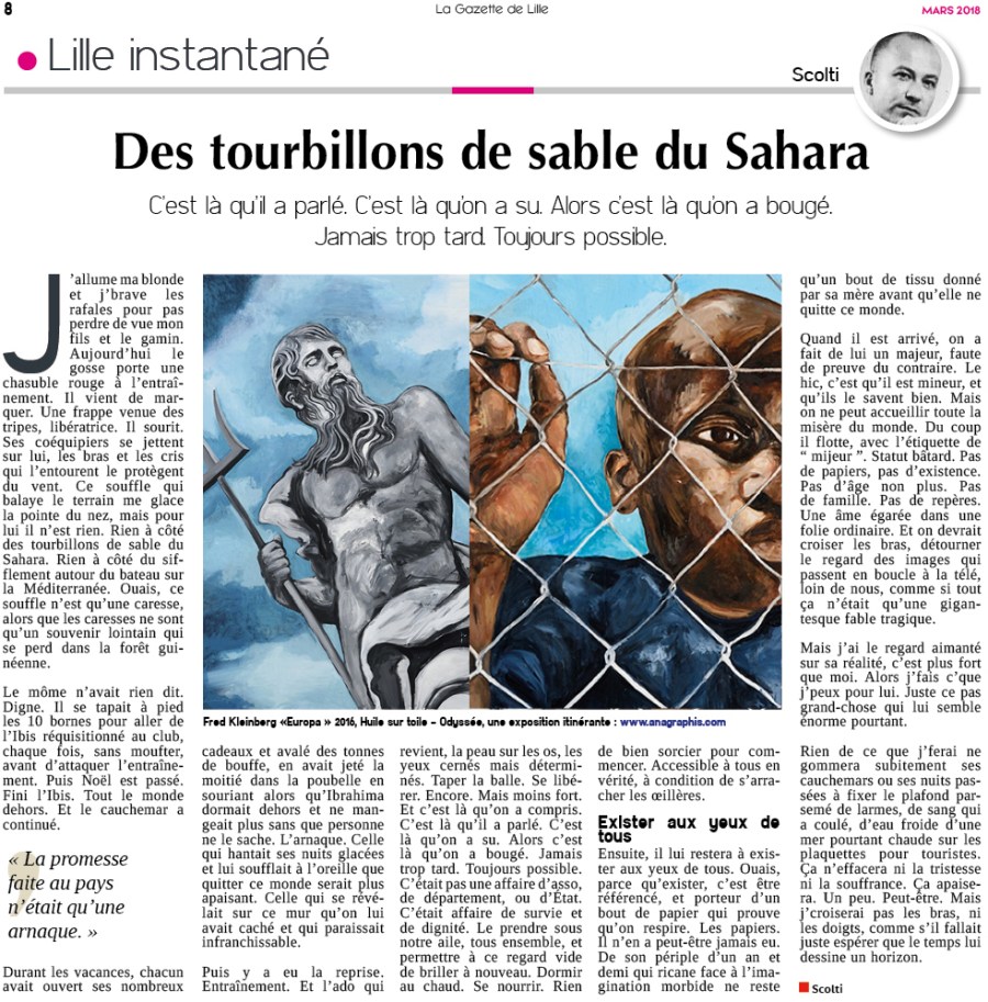 Quand il est arrivé, on a fait de lui un majeur, faute de preuve du contraire. Le hic, c’est qu’il est mineur, et qu’ils le savent bien. Mais on ne peut accueillir toute la misère du monde. Du coup il flotte, avec l’étiquette de mijeur. Statut bâtard. Pas de papiers, pas d’existence. Pas d’âge non plus. Pas de famille. Pas de repères. Une âme égarée dans une folie ordinaire. Et on devrait croiser les bras, détourner le regard des images qui passent en boucle à la télé, loin de nous, comme si tout ça n’était qu’une gigantesque fable tragique.
